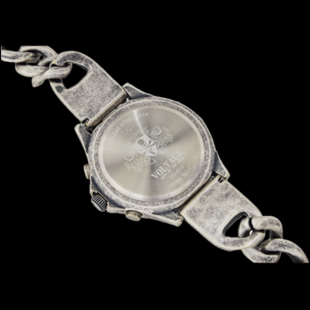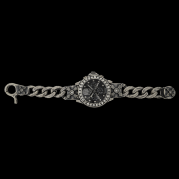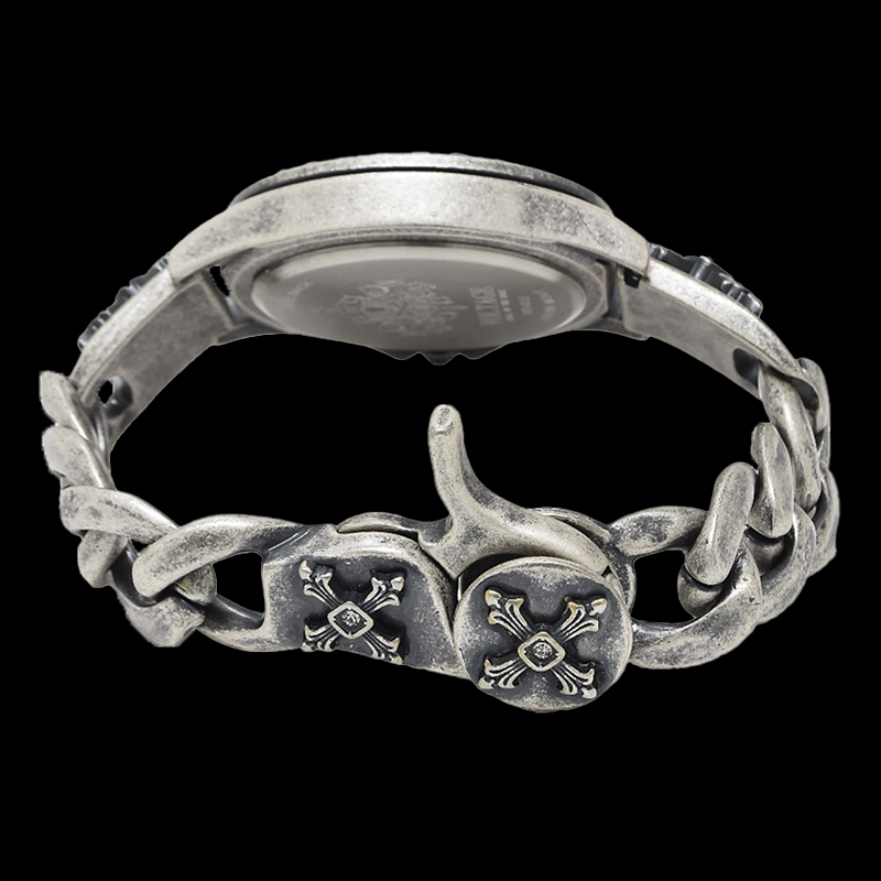 反骨の美学を腕に宿す、究極のギア「センチネル」のシリーズ10誕生。ダイアルのスカルソード アンティークシルバーのチェーンベルトの存在感は、覚醒の鼓動を刻む。正に「センチネル」=「守護者」の名に相応しいモデル。