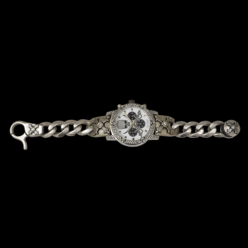 ダイアルに輝くスカルソードは、セラミック加工を施し細かく美しい仕上がり。クロノグラフムーブメントを搭載、メカニックな一面も持っている。 148個のクリスタルを装飾し高級感がある時計本体、重厚感のあるアンティークシルバーのチェーンベルトにはゴシッククロスがあしらわれ、魂を揺さぶるモデルとなっている。