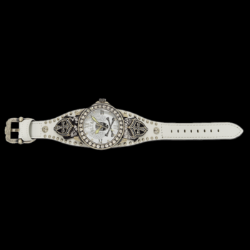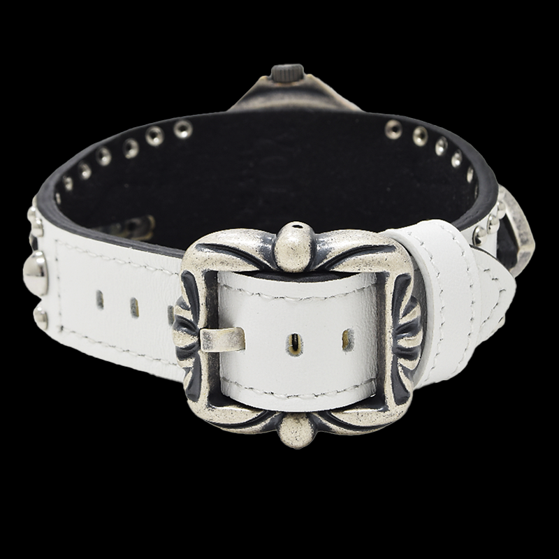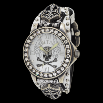 飛翔する魂を持つ者へ捧ぐダイアルのウィングスカルは、「自由を奪われない者」の証。 時計本体に配置されたストーンは鋭い輝きを放つ。レザーベルトのクロスシールドが荘厳な存在感を生み出している。