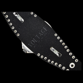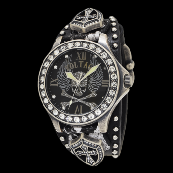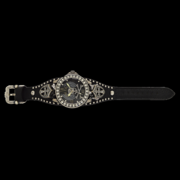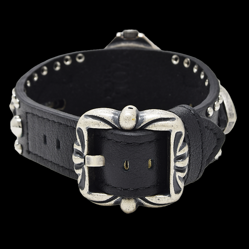 飛翔する魂を持つ者へ捧ぐダイアルのウィングスカルは、「自由を奪われない者」の証。 時計本体に配置されたストーンは鋭い輝きを放つ。レザーベルトのクロスシールドが荘厳な存在感を生み出している。