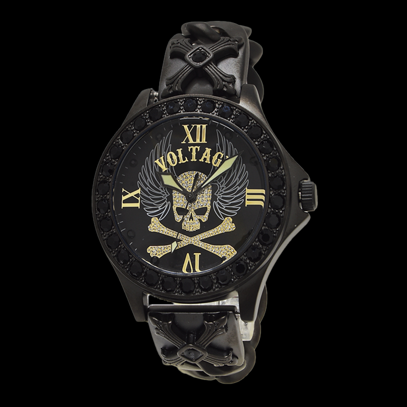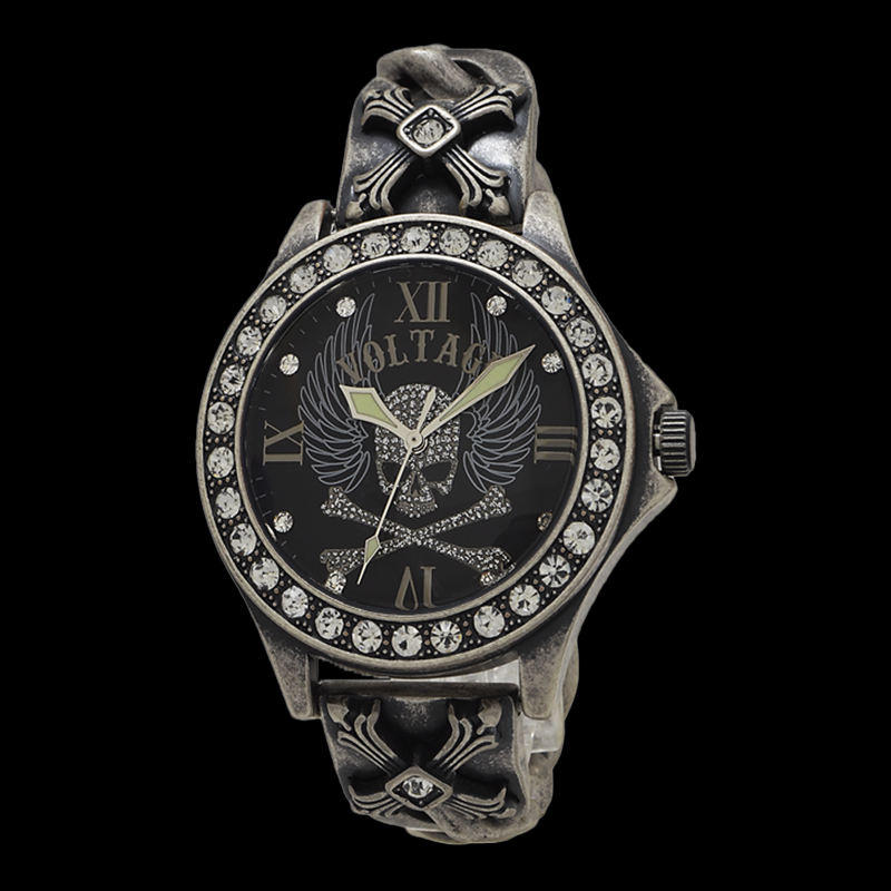 飛翔する魂を持つ者へ捧ぐダイアルのウィングスカルは、「自由を奪われない者」の証。 時計本体に配置されたストーンは鋭い輝きを放つ。無骨さと美しさが共存したチェーンベルト、唯一無二の存在感。